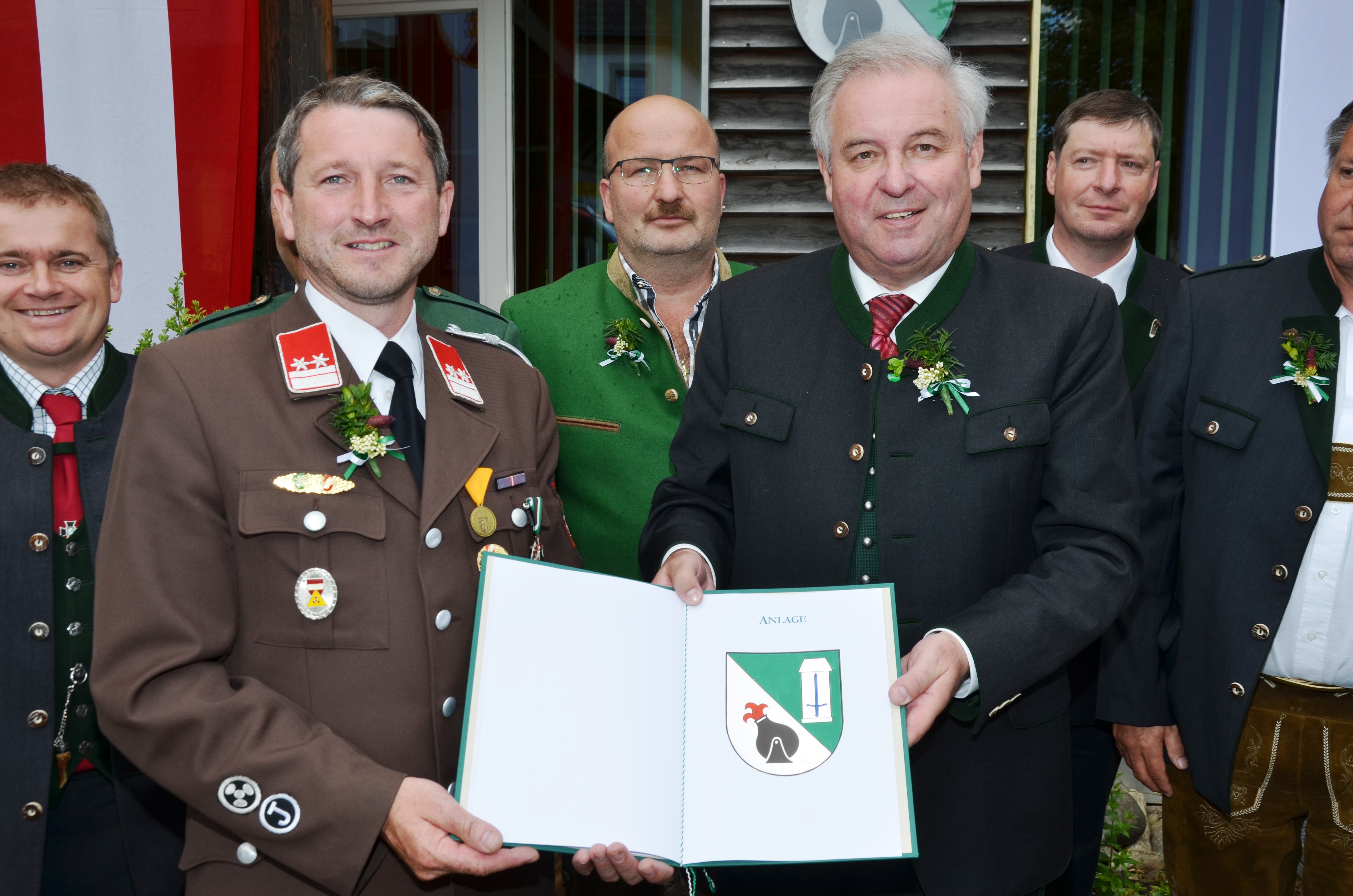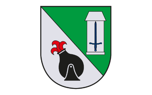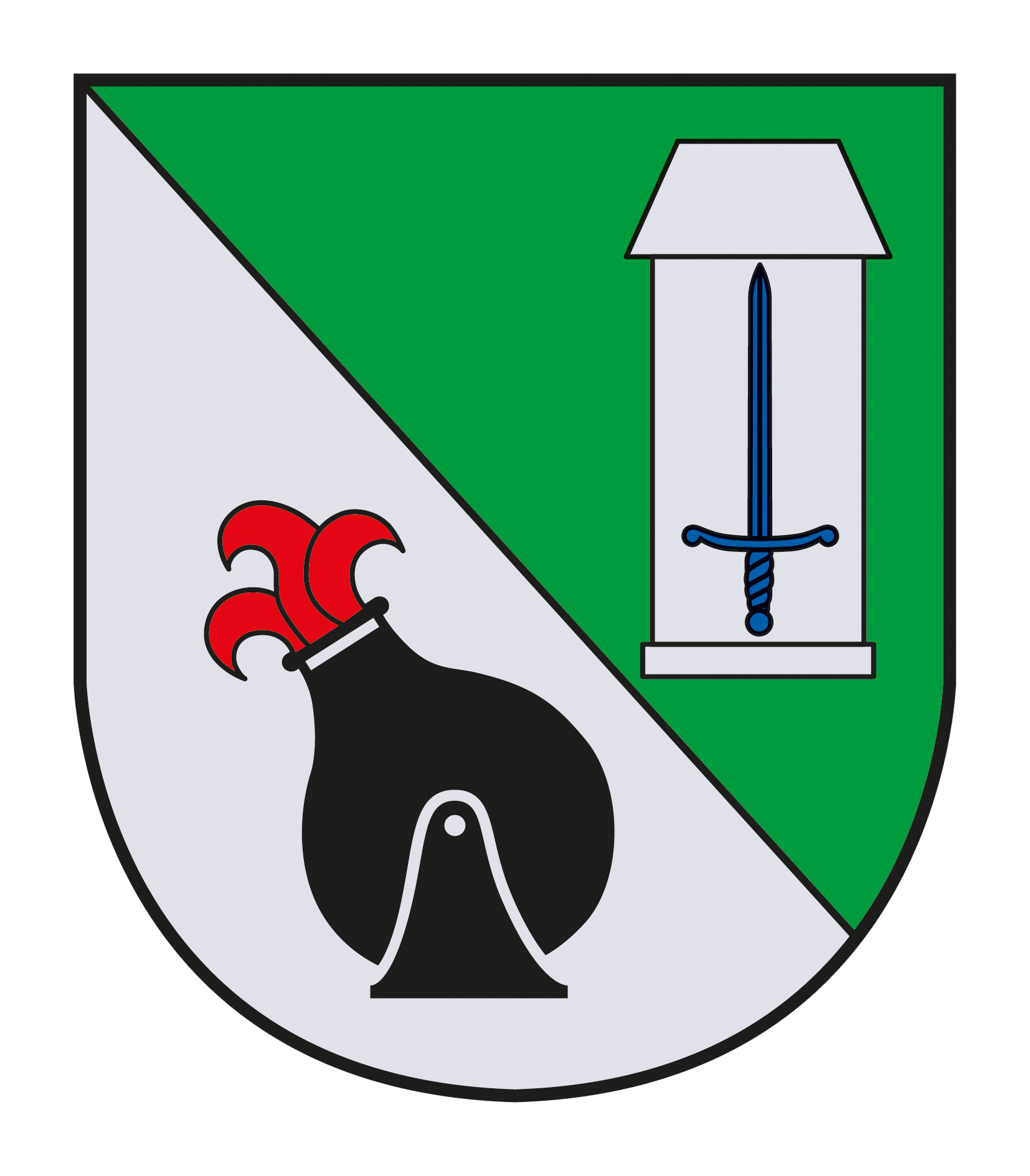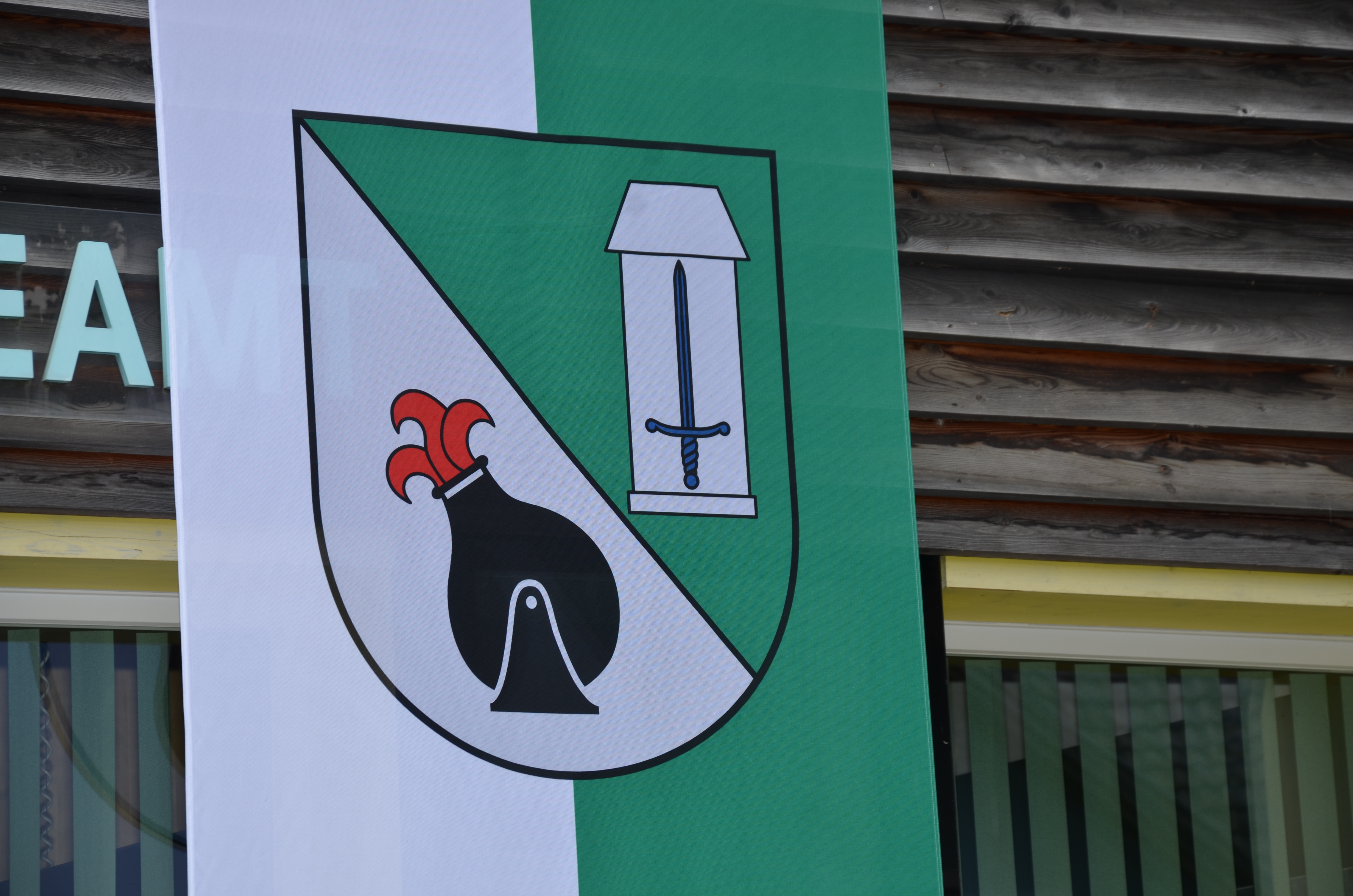 "In schrägrechts geteiltem Schild vorne in Silber eine schwarze, in ihrem Lager schrägrechts geschwenkte Bessemerbirne mit drei aus der Mündung schlagenden roten Flammen, hinten in Grün ein silberner bedachter und fensterloser Salzstadl, belegt mit einem pfahlweise gestellten blauen Schwert." |