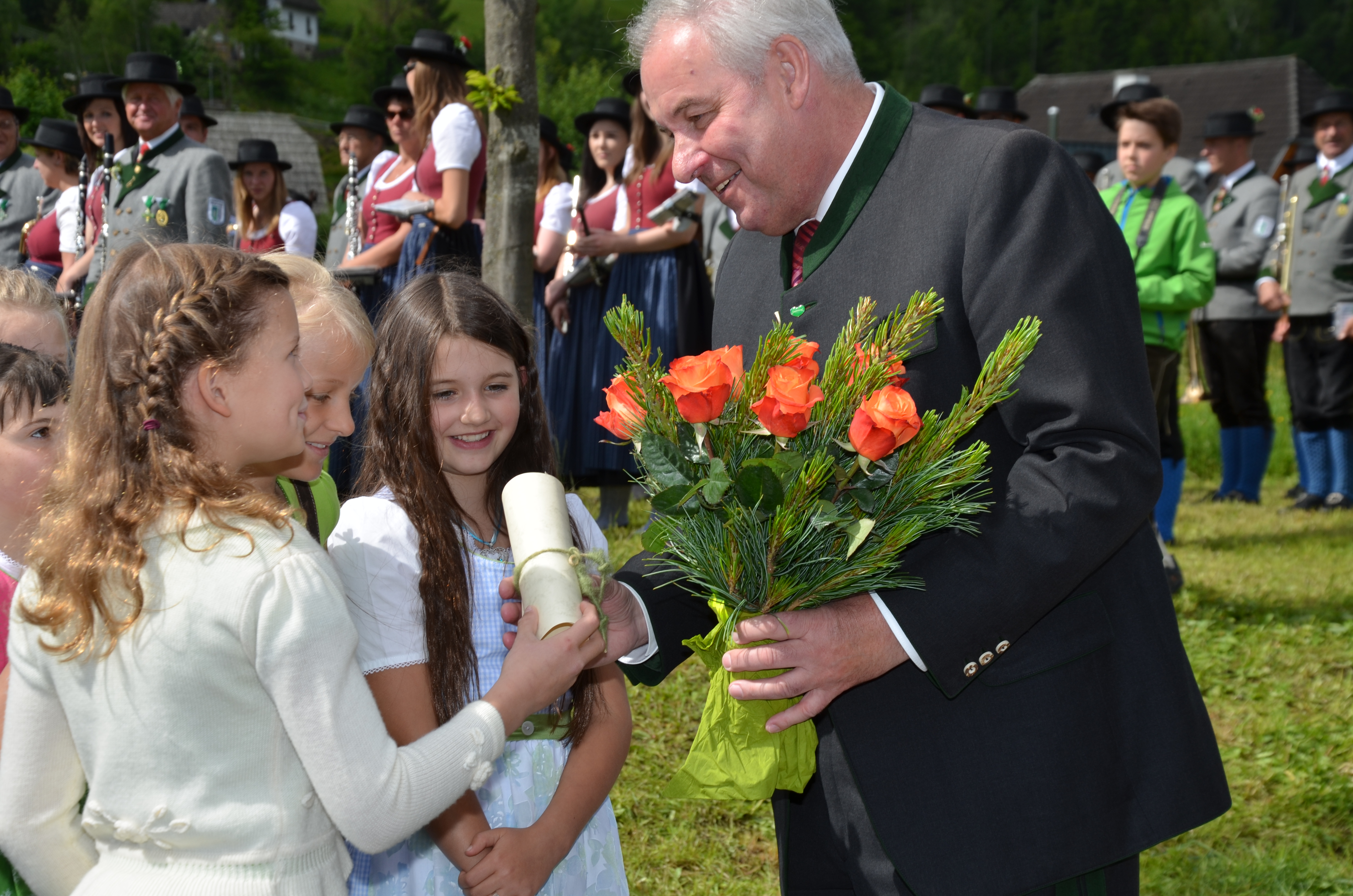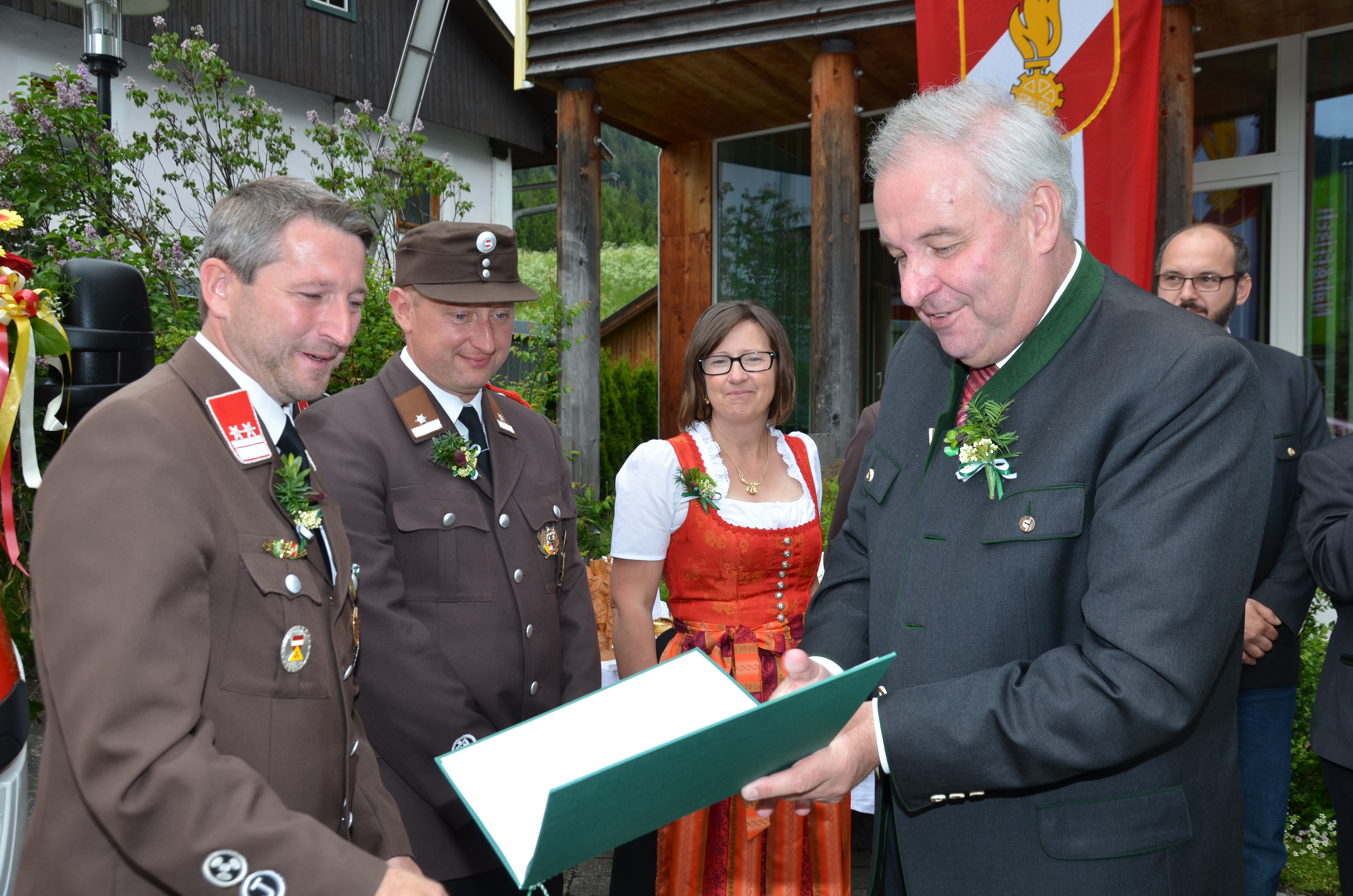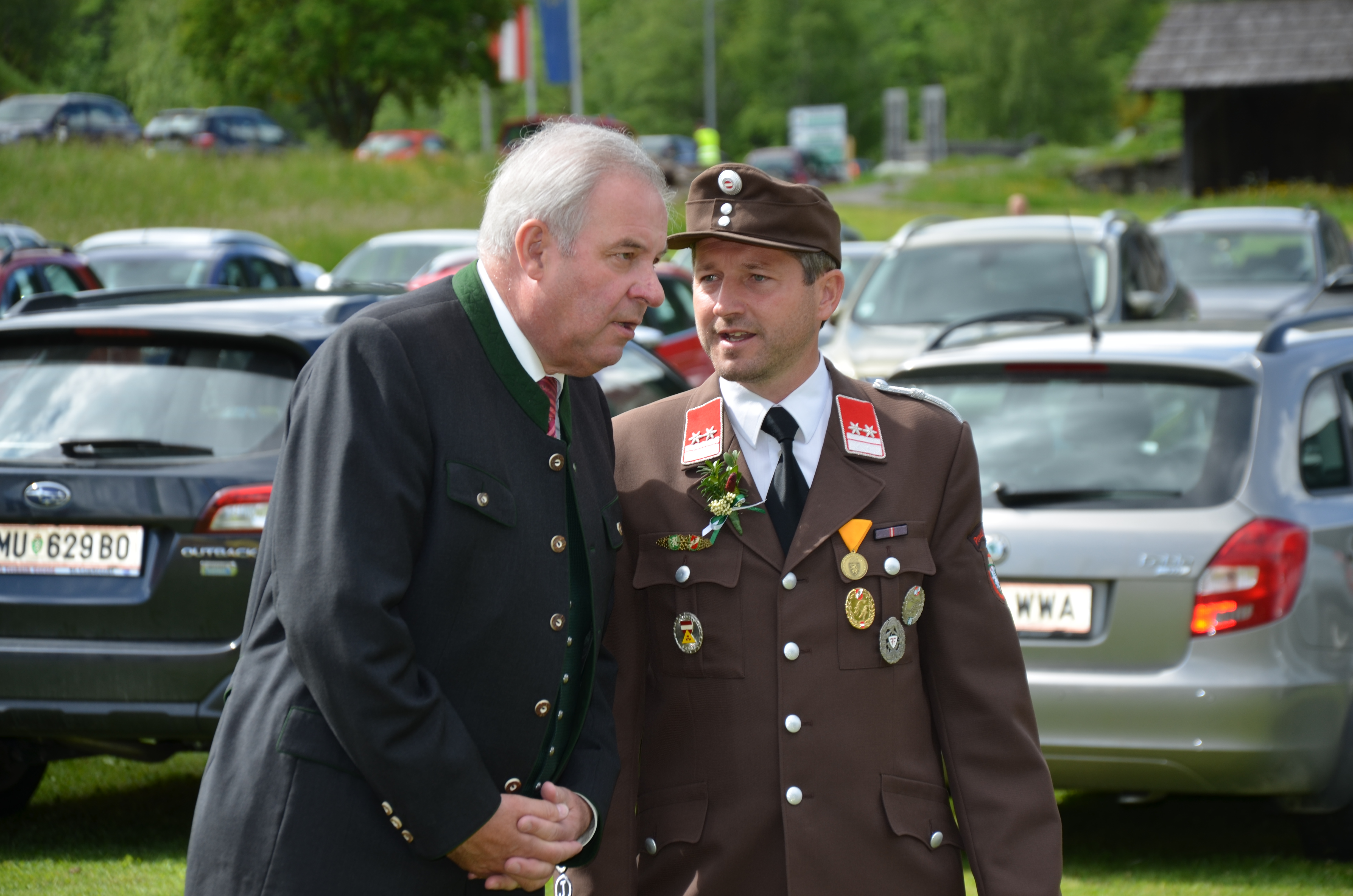 "In schrägrechts geteiltem Schild vorne in Silber eine schwarze, in ihrem Lager schrägrechts geschwenkte Bessemerbirne mit drei aus der Mündung schlagenden roten Flammen, hinten in Grün ein silberner bedachter und fensterloser Salzstadl, belegt mit einem pfahlweise gestellten blauen Schwert." |