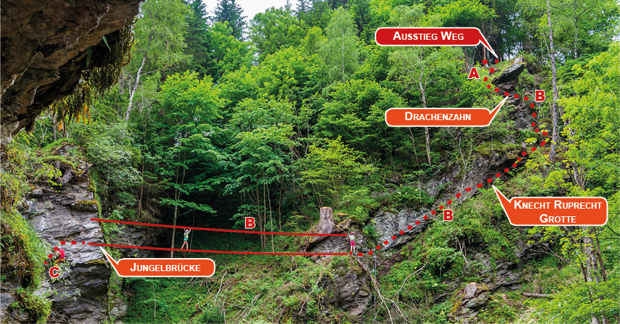 Der Klettersteit ist teilweise auch für Anfänger geeignet, jedoch sind einige Varianten bereits sehr anspruchsvoll. Auf alpine Gefahren wie Gewitter, Hochwasser, lockeres Gestein, u.s.w. ist bimmer zu achten! Sollte eine Bergung auf Grund von selber verursachten Fehlern oder falscher Selbsteinschätzung notwendig werden, muss mit Bergekosten gerechnet werden.