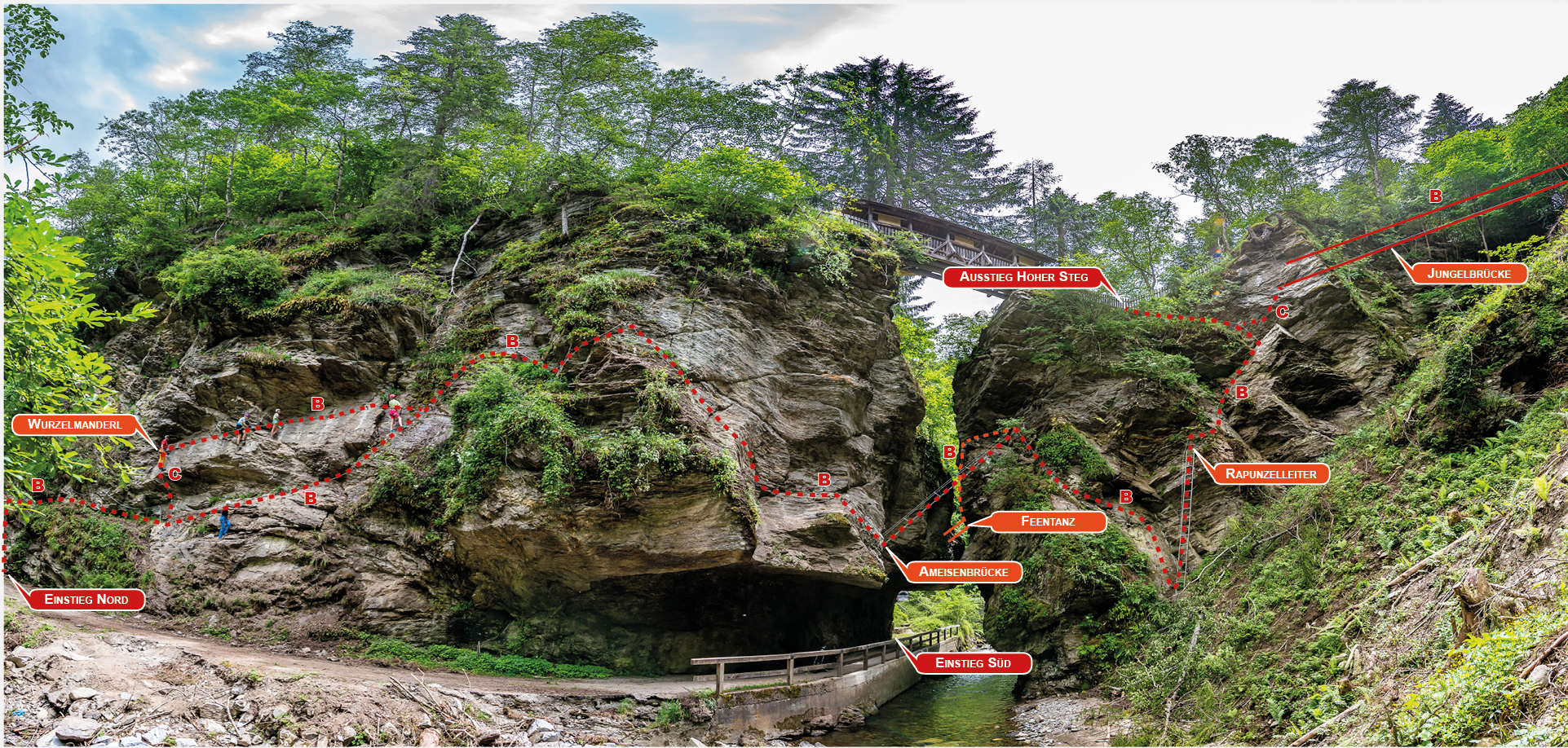 Bisher konnte man die Klamm nur von der alten Bundesstraße aus oder vom darüber errichteten Holzsteg bewundern. Seit 26. Juli 2019 wurde mit der offiziellen Eröffnung des ersten Klettersteigs im Bezirk Murau nun die Möglichkeit geschaffen, dieses kostbare Naturdenkmal aus ganz anderen Perspektiven zu bestaunen.